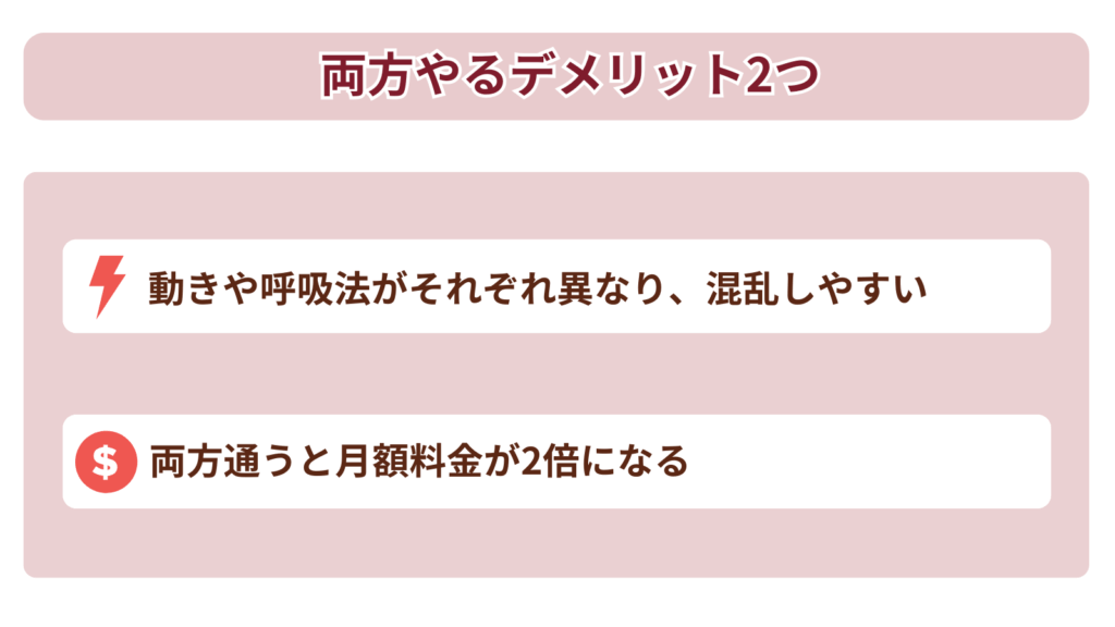ホットヨガとマシンピラティスを両方やる場合、以下2つのデメリットがあります。